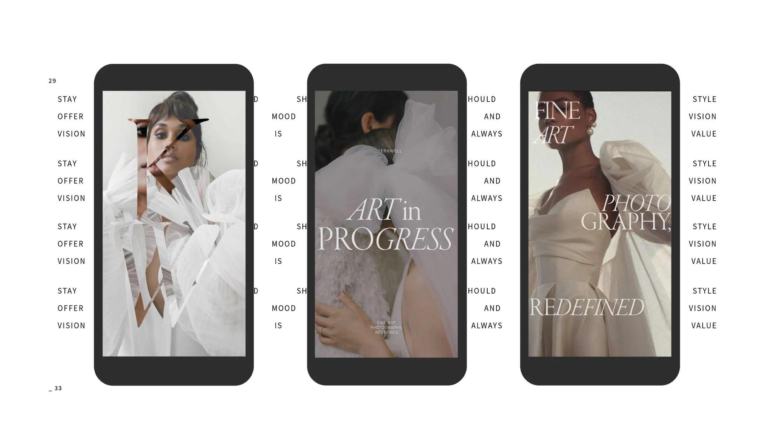 Their brand identity was crafted to reflect this same sense of understated luxury and confidence. It needed to feel elevated, but never out of reach, warm, poised, and intentional. Playful typographic placement and elegant font pairings brought subtle rhythm to the visual language, while tactile print finishes, think fibrous stock and crisp letterpress, echoed the texture and depth found in their photographic style. The result is an identity that feels as considered as the stories they tell through the lens.